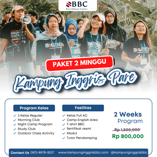 kami adalah kursus bahasa Inggris spesialis Speaking di Kampung Inggris Pare yang menggunakan standar materi pembelajaran British dan American English. Selain itu BBC Pare menggunakan metode khusus Explicit Speaking Method untuk mendongkrak rasa percaya diri para siswa dalam berbicara bahasa Inggris tanpa takut salah. Dan yang terakhir BBC (Bisa Bahasa Center) hanya menerima maksimal 60 siswa setiap periodenya demi menjaga kualitas dan kepuasan para member. So, amankan slot kamu sekarang juga sebelum kehabisan!